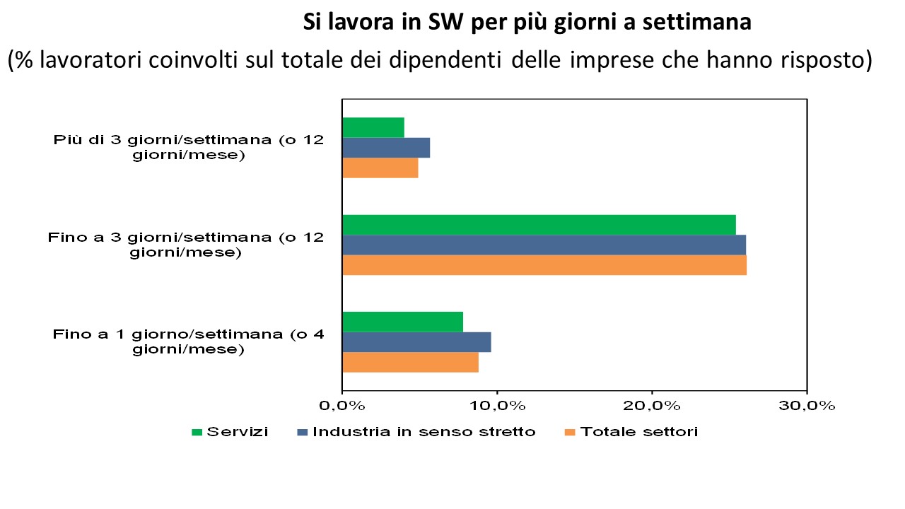 Lo smart working non è per tutti i lavoratori. L’accesso è riconducibile prevalentemente alla compatibilità della mansione (nell’84,2% delle risposte). Ma anche alle adeguate condizioni di accesso alla connessione (62%) e all’appartenenza a specifiche aree aziendali (53%). Circa due aziende su cinque poi stipulano accordi individuali col lavoratore, il restante 60% circa si affida a regolamenti aziendali. La frequenza dello Smart working? Quasi un lavoratore su tre nelle imprese che hanno adottato o adotteranno in via strutturale lo smart working, lavora in modalità agile almeno 3 giorni a settimana, l’8,8% al massimo per un solo giorno a settimana.