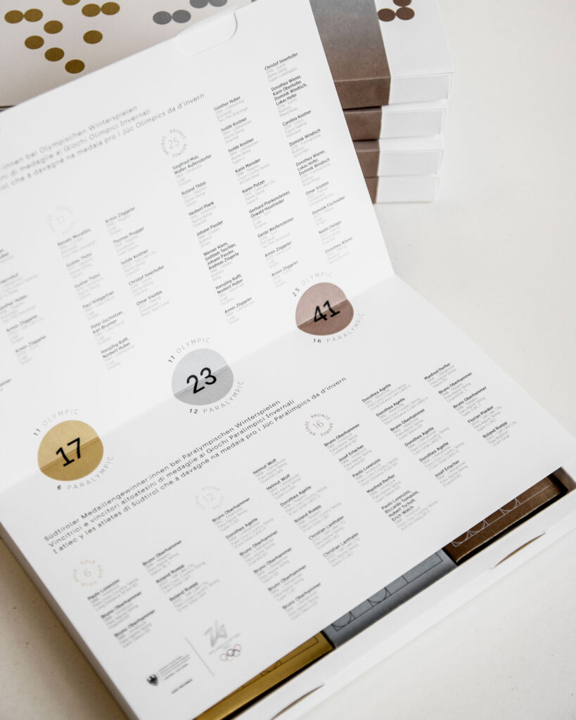 Arnold Kaser: Zu Beginn haben wir dieses Produkt einfach für uns selbst entwickelt. Auf dem Cover haben wir Gold, Silber und Bronze als Kreise dargestellt, um die Anzahl der Medaillen der Südtiroler Gewinner:innen widerzuspiegeln. Im Inneren finden sich die Namen der Sportler:innen sowie Disziplin, Jahr und Ort ihres Sieges. Anschließend haben wir dieses Geschenk an einige Freunde, Kunden und Partner verteilt – ebenso an die IDM. Dort zeigte man sich von der Idee sowie von Qualität und Nachhaltigkeit des Produkts begeistert, sodass daraus schließlich ein Auftrag wurde.